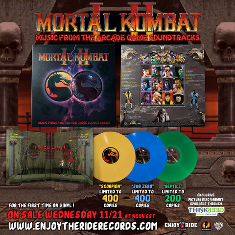Enjoy The Ride Records is the exclusive retailer for three variants: Scorpion Yellow (limited to 400 copies), Reptile Green (limited to 200 copies) and Sub Zero Blue (limited to 400 copies). Our friends at ThinkGeek will be carrying an exclusive picture disc, which is limited to 1,000 copies.