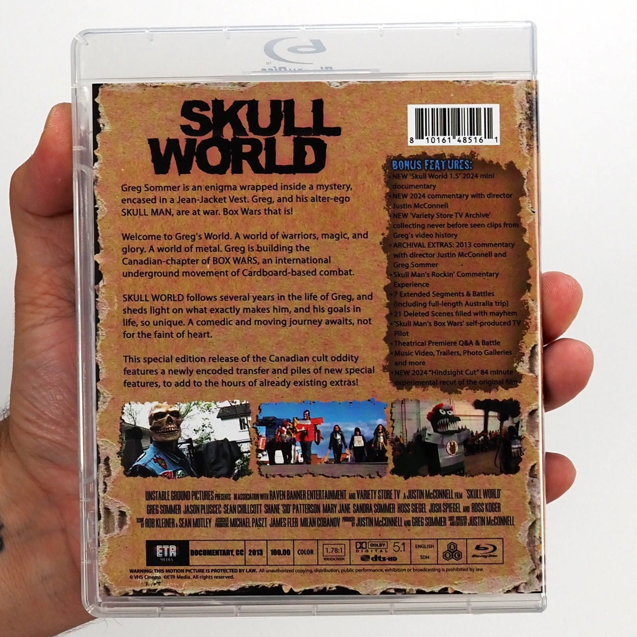 Greg Sommer is an enigma wrapped inside a mystery, encased in a Jean-Jacket Vest. Greg, and his alter-ego SKULL MAN, are at war. Box Wars that is! Welcome to Greg's World. A world of warriors, magic, and glory. A world of metal. Greg is building the Canadian-chapter of BOX WARS, an international underground movement of Cardboard-based combat. SKULL WORLD follows several years in the life of Greg, and sheds light on what exactly makes him, and his goals in life, so unique. A comedic and moving journey awaits, not for the faint of heart. This special edition release of the Canadian cult oddity features a newly encoded transfer and piles of new special features, to add to the hours of already existing extras!